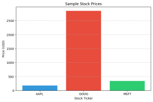 import pandas as pd: We import the pandas library, giving it the standard aliaspd.import matplotlib.pyplot as plt: We import thepyplotmodule from matplotlib, aliased asplt, for plotting.data = {...}: We create a Python dictionary to hold our sample portfolio data.df = pd.DataFrame(data): We pass our dictionary to the pandasDataFrameconstructor to create our main data structure.print(...): We print the DataFrame to the console.plt.figure(...)andplt.bar(...): We use matplotlib to create and customize a bar chart from our data.plt.show(): This command displays the final plot.
